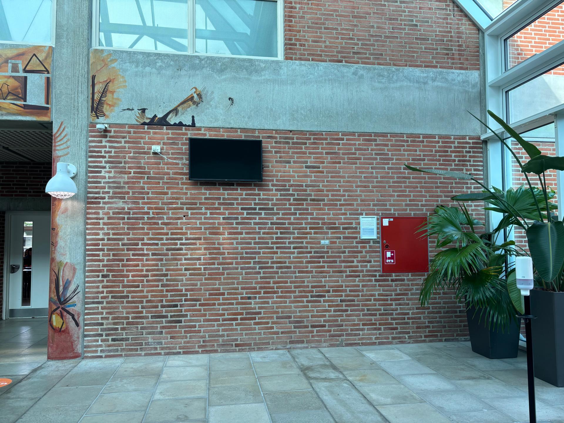 - Vær bevidst om, hvilken platform du kommunikerer på. Mange af skærmene er små og hænger højt i gennemgangsrum eller kantiner (se evt. galleri nedenfor). Indholdet vises i ca. 10 sekunder og indgår i et flow af mange andre informationer.